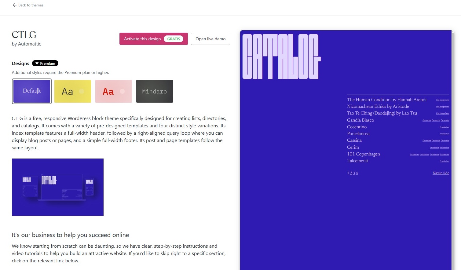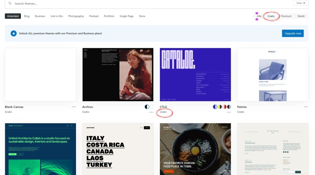 Oh well, so just to show you what I discovered, I took screenshots, my WordPress is in Danish, and so I should tell you that GRATIS means FREE. So this hideous layout is one of the 4 first suggested, both when you open the ‘themes’ and the default page is all layouts, and you click the ‘free‘ filter and then it’s still one of the 5 first. it even says free under it