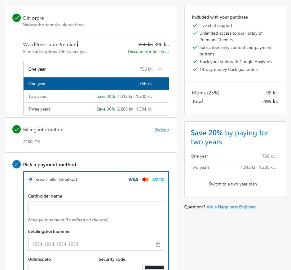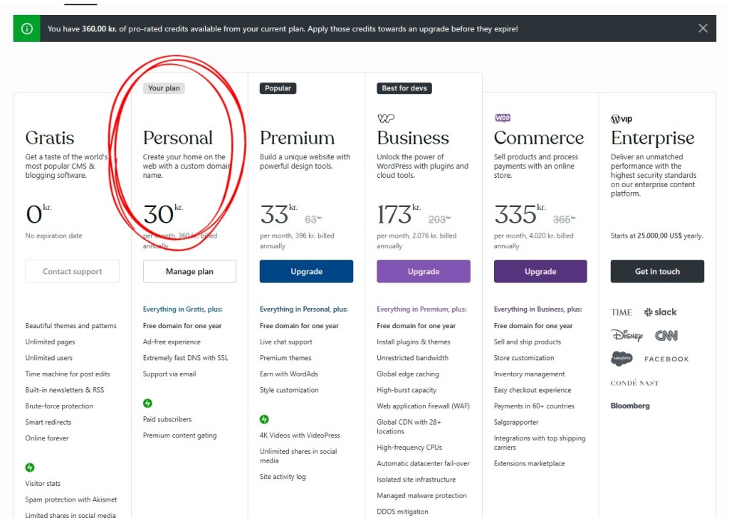 I will however check back on this when my personal plan is running out, cause if I can get premium THEN for the same price as right now, that being 396kr, YES then it’s a really good deal. I hardly think that WordPress would allow a loophole like that, but you never know.