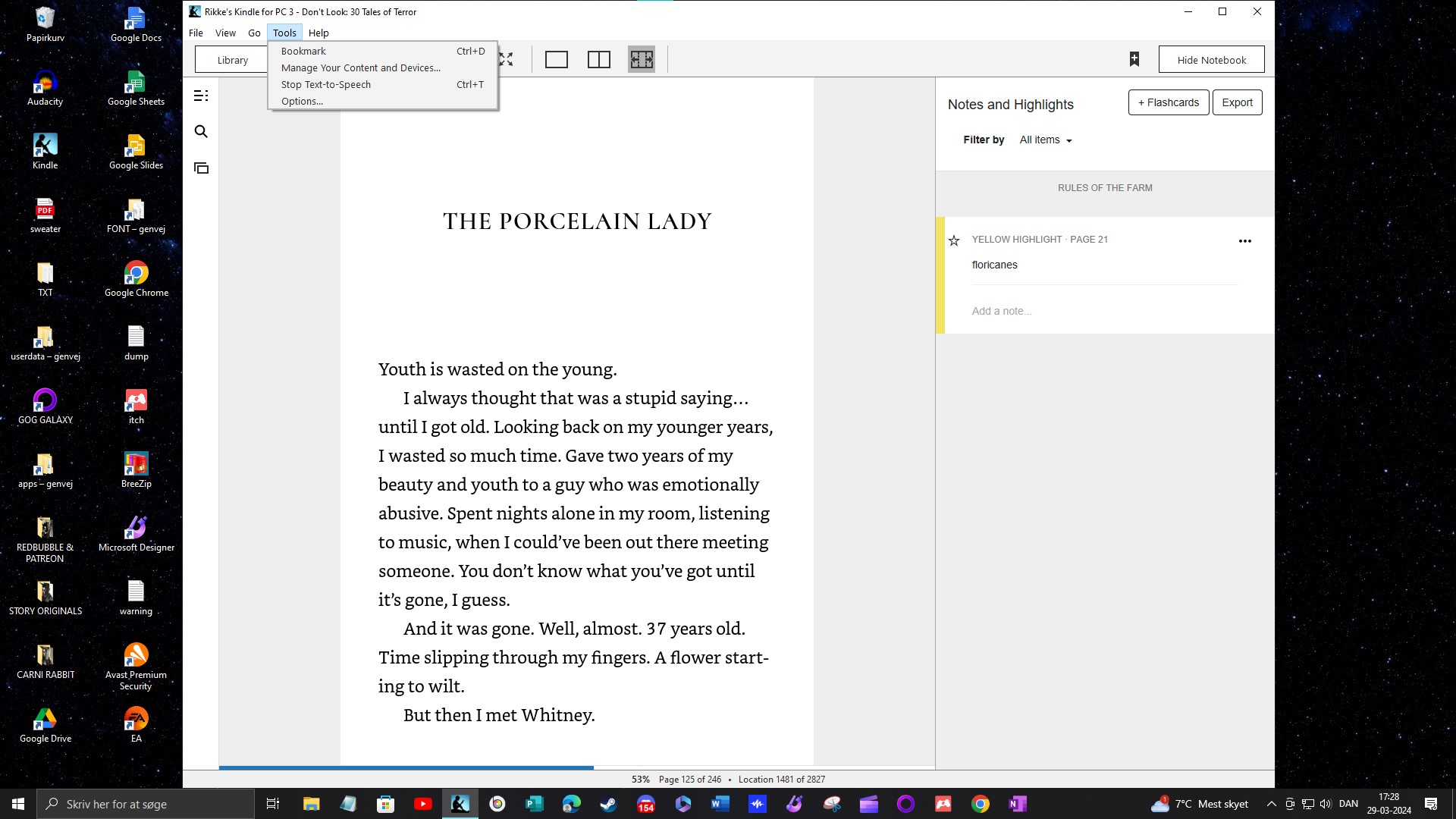 And the kindle tip I flaunted in the banner graphics, well – I use Speechify to read my kindle books back to me. But I found out that if you use the desktop app of kindle, they actually have a TTS (but super robot sounding)