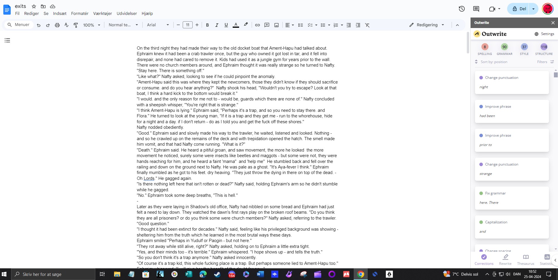 Here you see outwrite as a addon to google docs, and it found a bunch of stuff as you can see – you click the individual suggestion and you can change it, or ignore it.