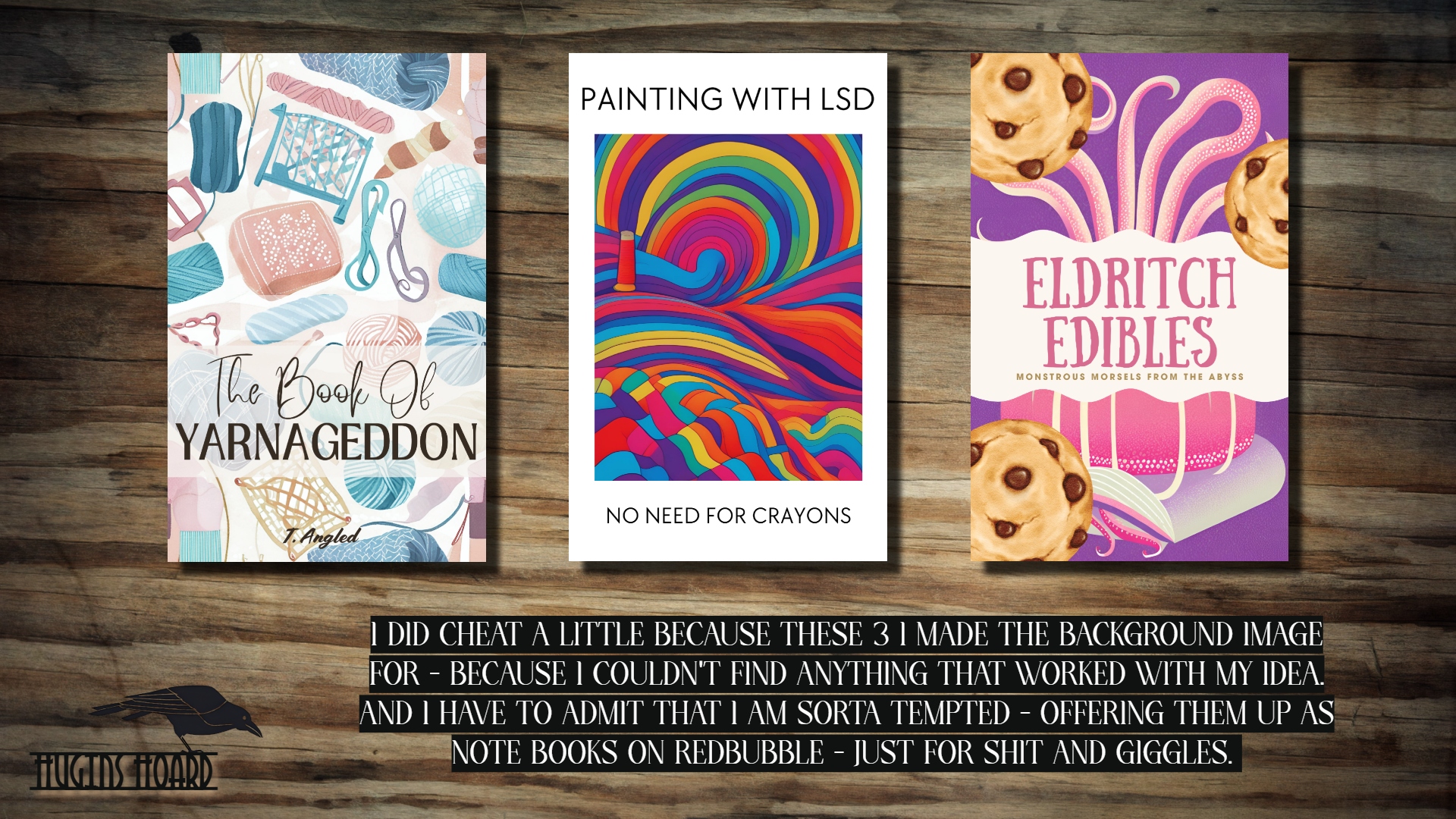 So they are all just postcards and notebooks, of these I picked out for Redbubble, except the Eldritch Edibles, that is a poster too. I mean when I started this post i had no intention of making these notebooks, but I just thought it was funny – It is both in my tags and blurb that it’s canva templates, only the text is mine (except for the Eldritch Edibles).