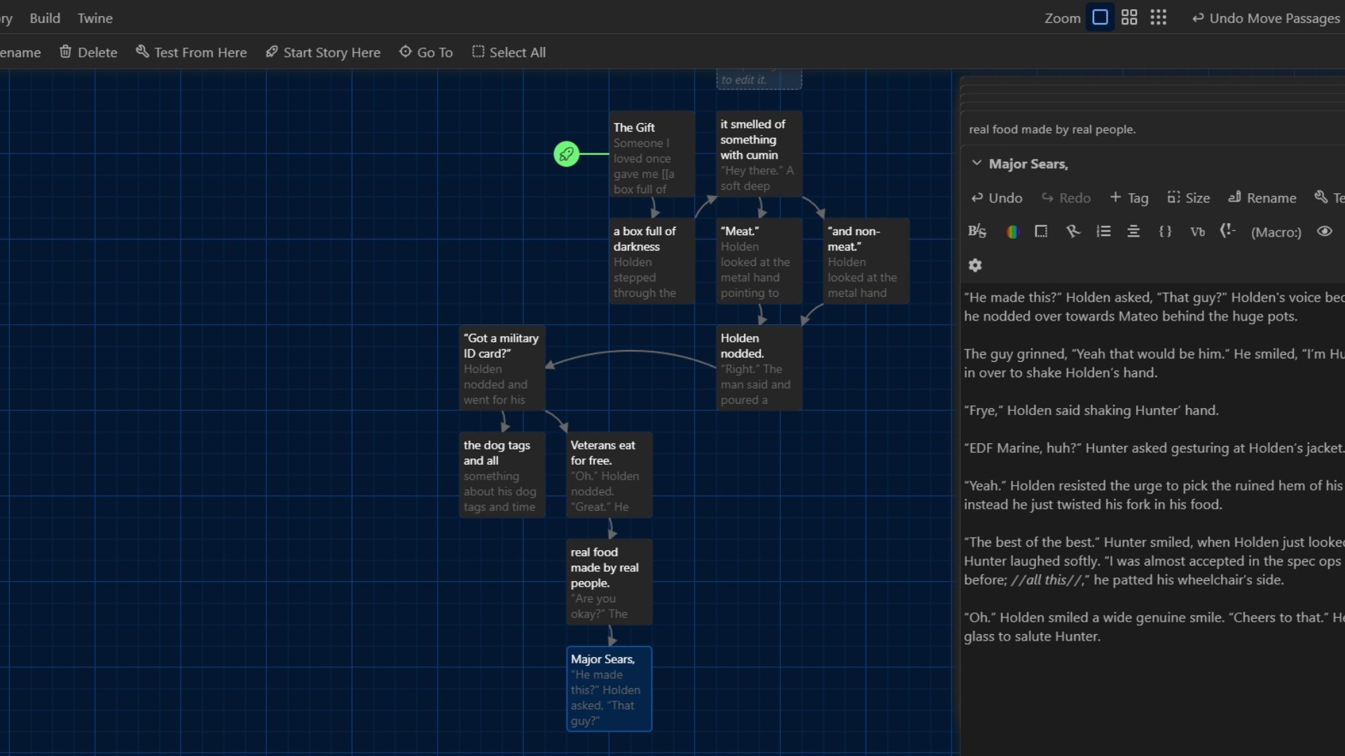 And besides that, I also worked a little more on my Twine project, finally tackled trying to insert the edited text. This project doesn’t really have a name, but it’s a rewritten version of an old fanfic called Battle Brothers. I kept the bromance, but I changed the names, and the fandom actually, switching it to a Dead Space thing – yeah well I worked it over just before I wrote Silentia Aeterna.