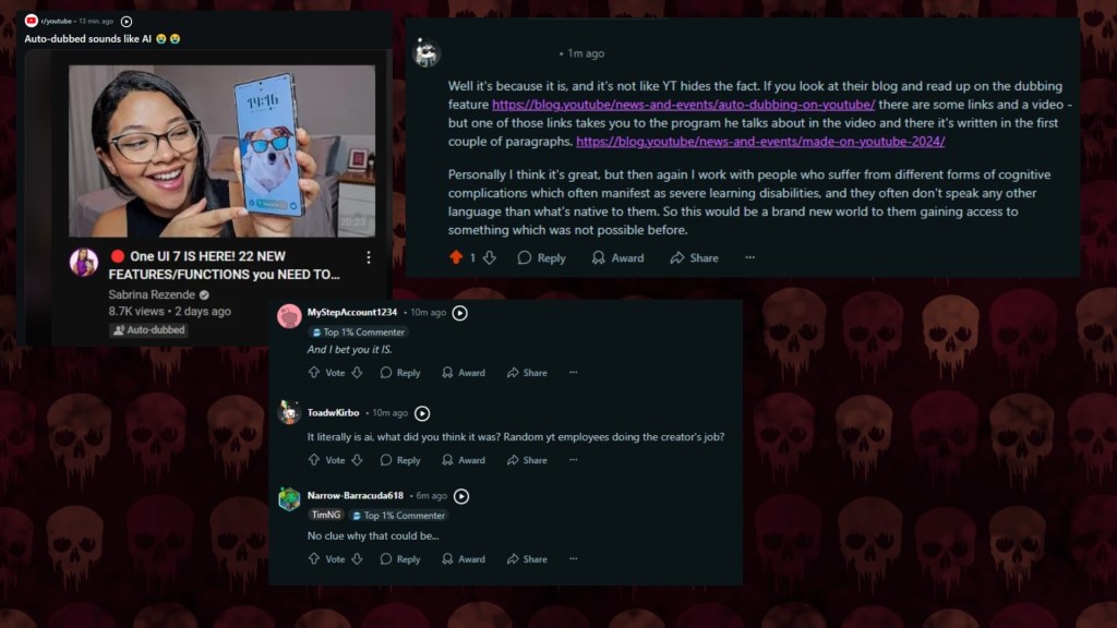 This for instance is just straight up dumb. Someone points out the new dub feature on YT sounds like AI, and the salty crowd jumps it in a very predictable way. The long comment there is me, pointing out that it is a tool of accessibility, and I was very, very close to accuse those fuckers of r/americandefaultism – like what did they think auto subtitles are?