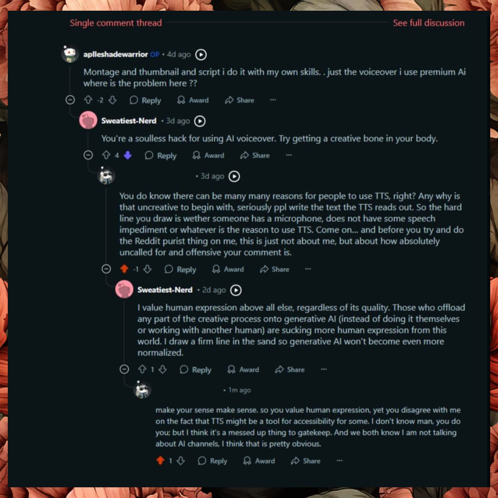 The nameless commenter is me, and this is the amount of shit this poor youtuber is getting, and he don’t even know what the fuck hit him. And of course I think I’m right and that I have a pretty good argument. Because seriously, ‘human expression’ my fucking ass! What they do is to gatekeep expression, and I don’t know if they even realise it.