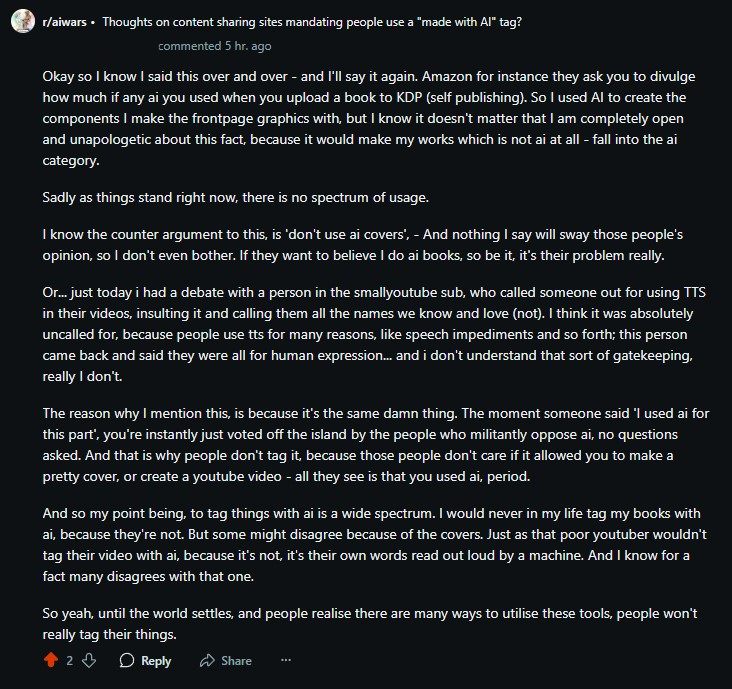 And really I added this post of mine to a similar question on reddit, so I didn’t have to type it all up again – because really IS the issue. That where we are at now, there is no distinguishing for those people, anything ai = everything ai = fraudulent.