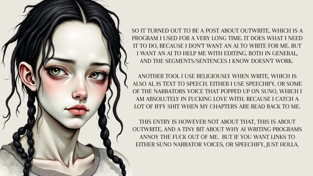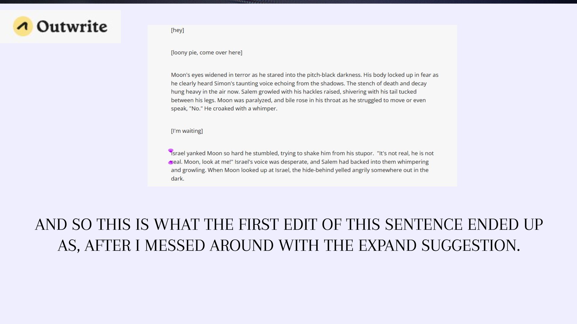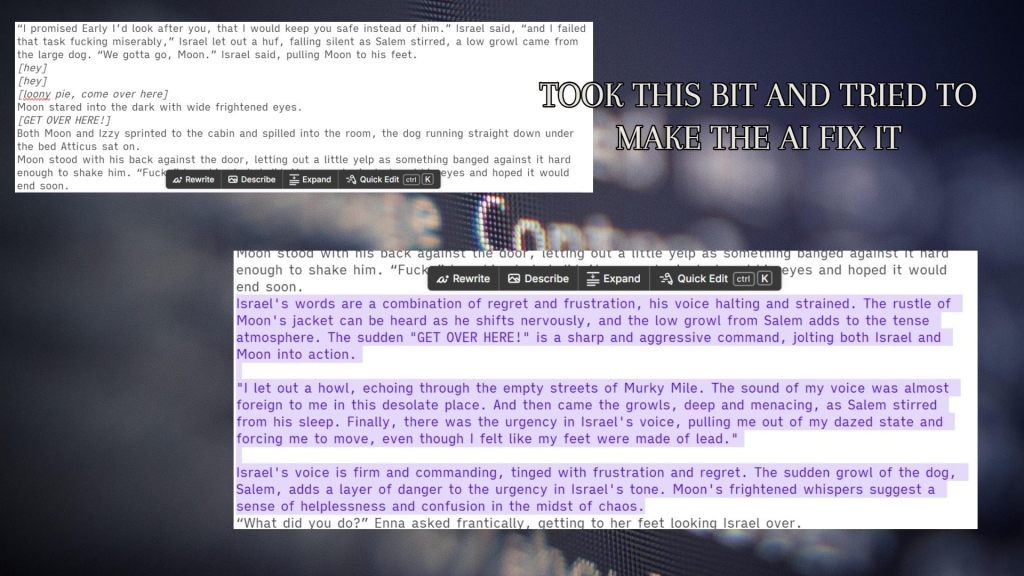 It’s an ai for fucks sake, so ‘contemporary’ or ‘casual’ speech isn’t really what it’s best at, and you only have those two options besides ‘regular’ – and that is formal and casual. But what Casual is good at, is speech – so if your character says something like ‘I failed at that task’ – who says that? well me, cause I wrote it, but remember this text has not been edited at all, this is the raw file where I just wrote whatever fell out my head. This edit in Outwrite is first edit, and in this case the ai suggest ‘and I messed that up’, which absolutely sounds more like something Izzy would say.