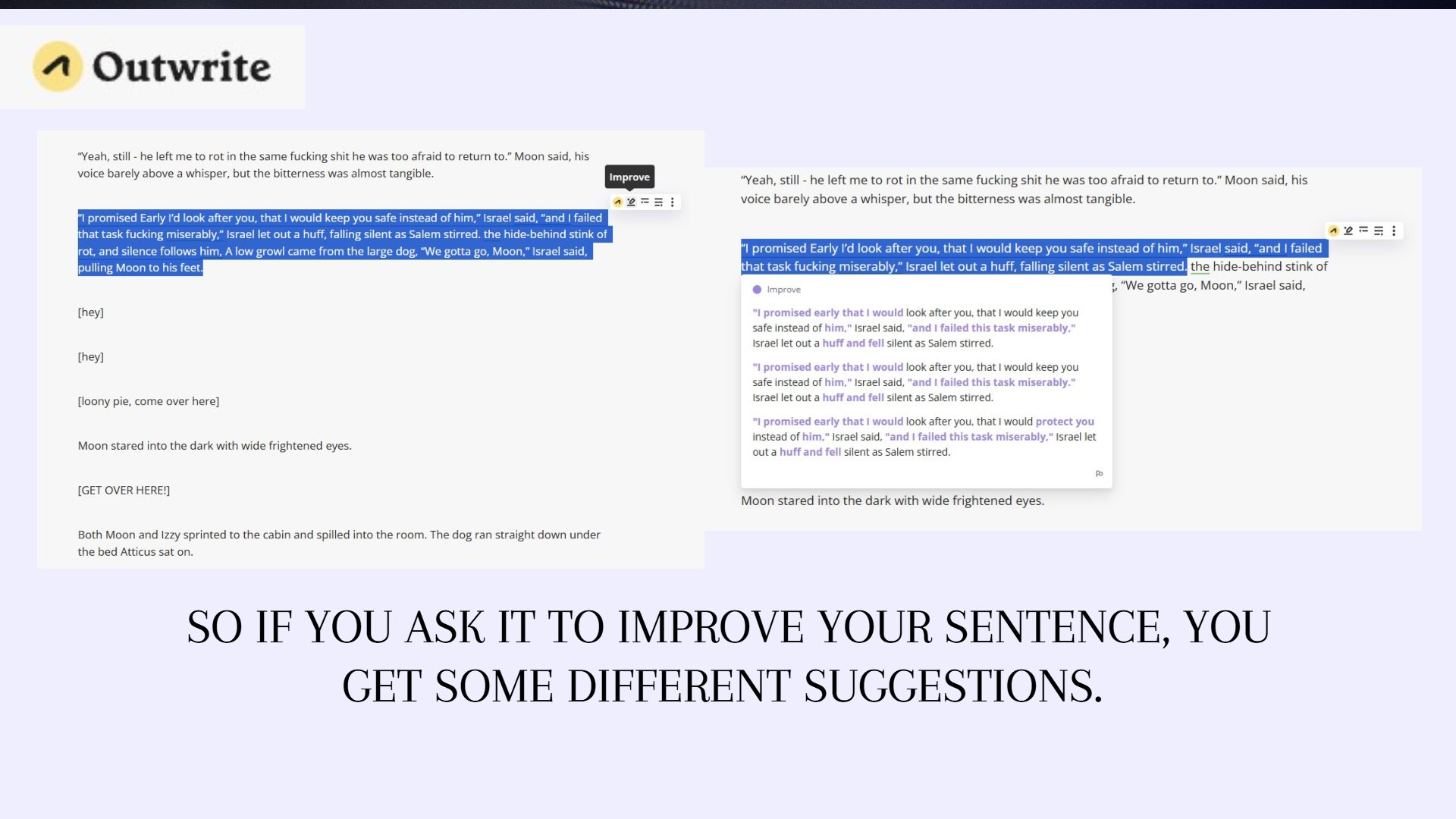 Even if I think the suggestions here are more relevant, and better than Sudowrite, then you have to edit them too – often it adds some words that is either not one you want to use, or in a tone you don’t use. So see the improve option as a crutch to change your sentence if you just hate everything about it.