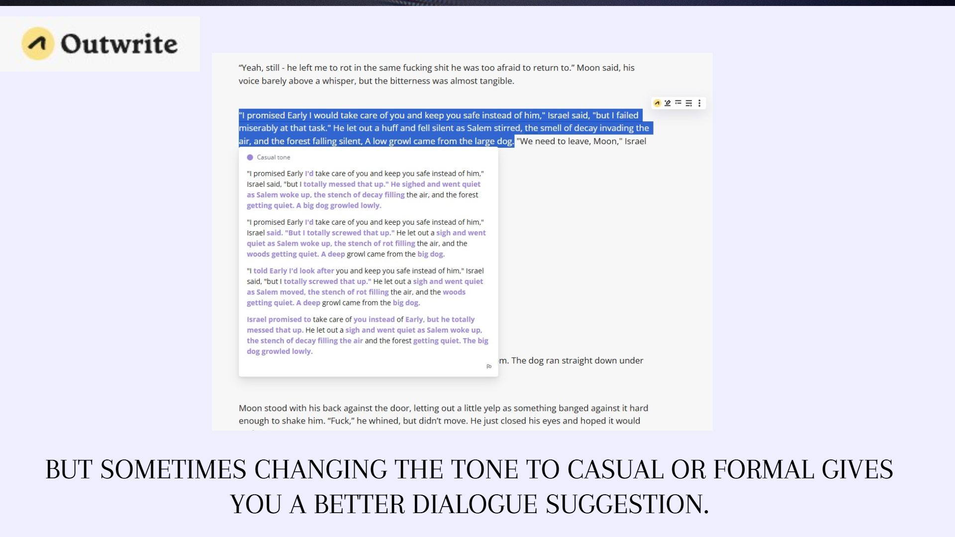 Just be careful because like in this case, it does change your entire paragraph to ‘casual’ – and I did this because I wanted to just shift that entire paragraph because I hated the original. But otherwise, isolate your dialogue, and use the ‘casual’ option on it.