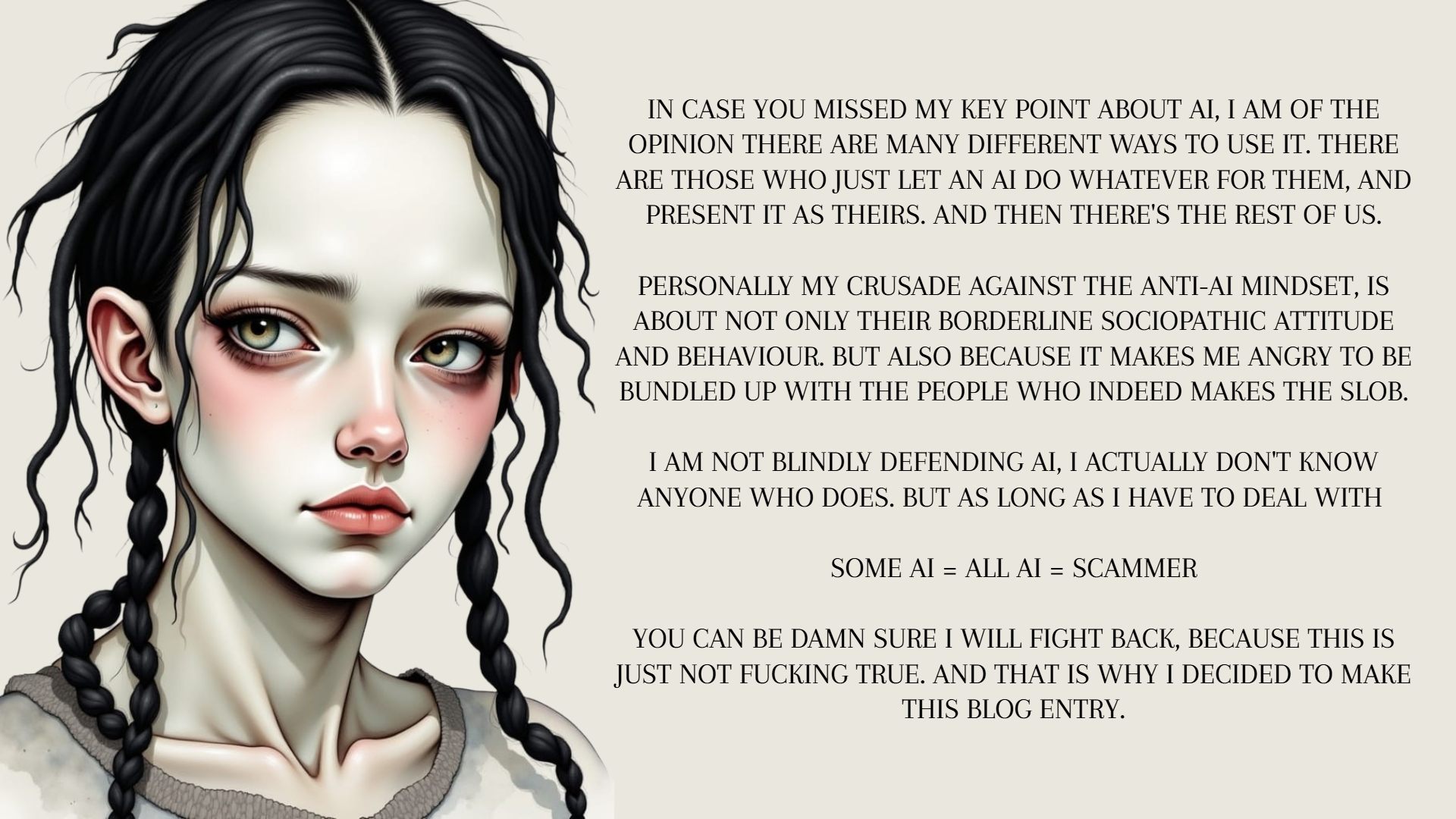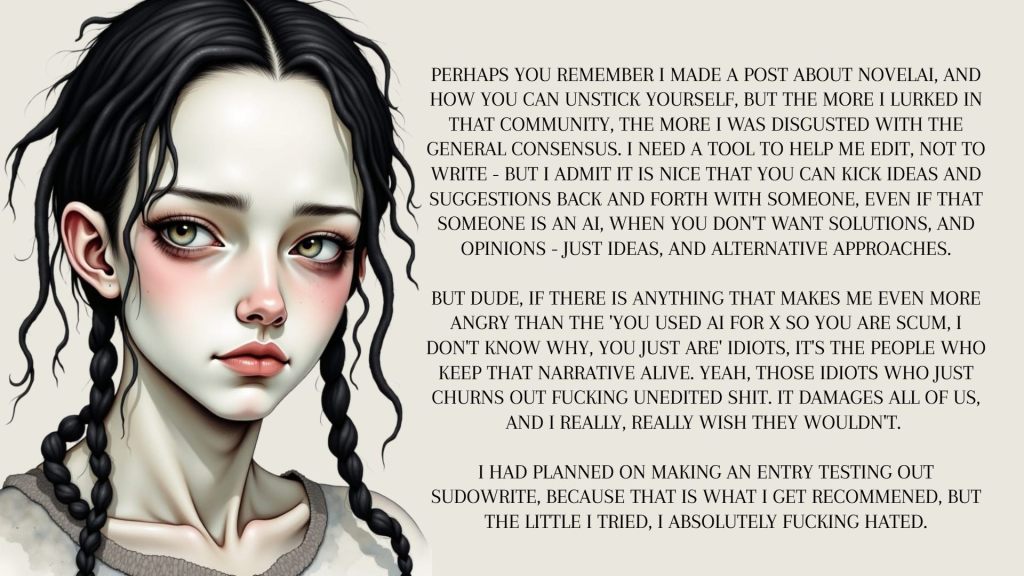 So I lurk in many subs on Reddit, also subs that I strongly disagree with. And if you think I am one of those gung-ho ai people, you’d be wrong. There is a sub (there’s several) for writing with ai, and I get so fucking angry when I look at it. It’s just post after post, on how to avoid AI detection, and how to not write a book, but get the best AI to just do it for you.