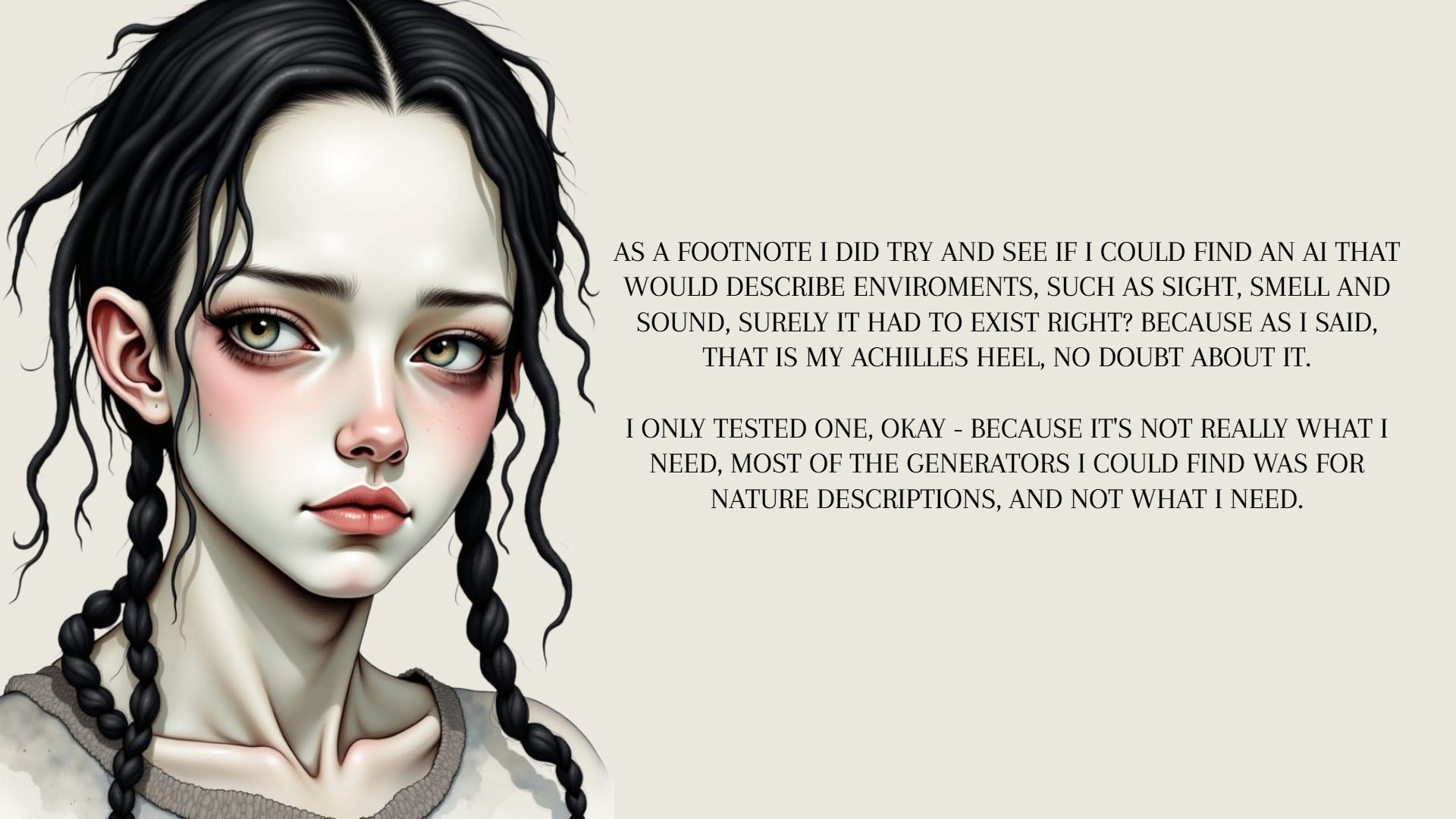 So, one of my major issues when writing is describing stuff around my characters, I don’t find it interesting, it’s that simple, and I struggle to get the right words too. It’s like artists who hate making backgrounds. But when you write, you NEED the background, and that is why I tried out novel.ai back then, because it CAN actually give you suggestions to environmental descriptions, even in it’s old build.