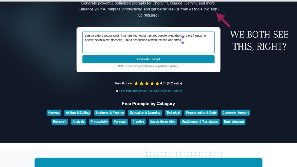 And to get double that, which by my best estimate is 0 because two times 0 is still 0. I am required to sign up, remember to that ‘no sign up needed’ solution to make prompts for other AI engines.
