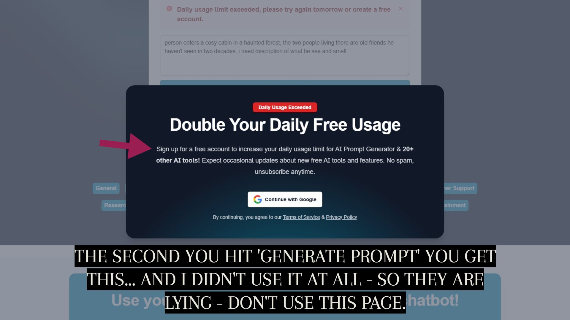 Well, the second you hit ‘generate prompt’ you’re given this window. And okay – but I didn’t make a prompt AT ALL! This means my daily usage is 0.