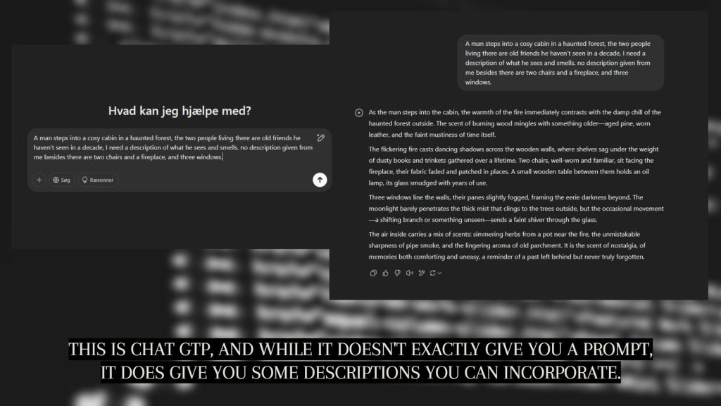 So I figured id show you a tip, like I said in the card of this section. This is chat gtp, and the result isn’t real good, but if you like me struggle with descriptive words in a basically foreign language, depending on how sharp and to the point your prompt is, you can get some suggestions to phrases or words that you had not thought of.