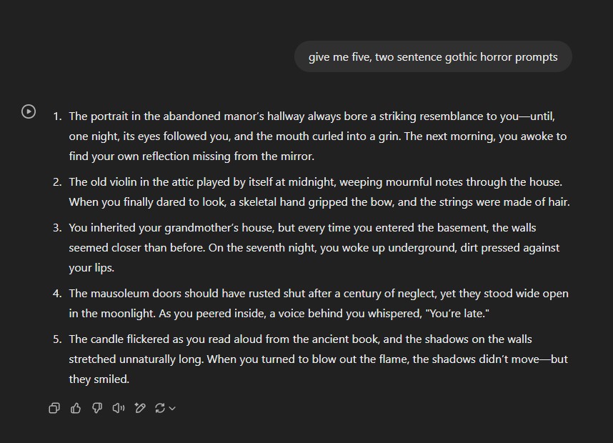 So I asked ChatGPT to make me five prompts for a creepypasta, you can see them here.