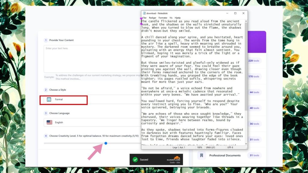 I circled the style, on this image you can see it’s formal, I did change that before I continued to creative, so the story would fit in tone. And a little pro tip, the more you move the slider right, the more freedom the ai have, but the shorter your text output is. And dude I was NOT about to sit there and do paragraphs of like 400 words at a time.