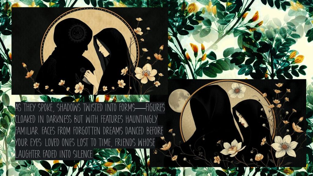 You stepped forward, compelled by an invisible force, each movement drawing you deeper into their realm. The air crackled with energy; it was alive, pulsing with unspoken truths waiting to be uncovered. As you crossed the threshold into their circle, a low hum resonated around you—a melody both haunting and beautiful.