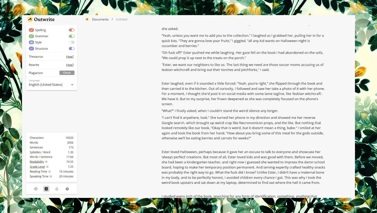 I wrote my text in google docs, I just didn’t take a screenshot – this is from outwrite, because I DID use outwrite to weed out weird grammar, and fix some sentences I couldn’t get to work. Just like i’d do any other writing project I do.