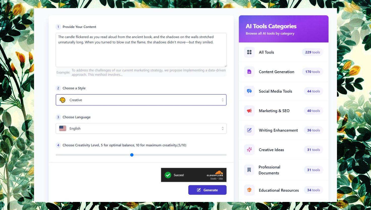 Here you can see I pasted the prompt from chatGTP in there, because that was what we need. I set it to creative, and left the slider in the middle, and hit ‘generate’.