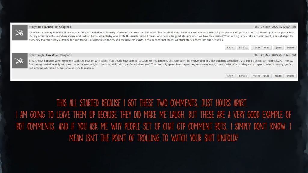 I saw some pretty wild comments on reddit that I sadly forgot to screenshot, and this post is long enough as it is – so I’ll just recap. There is this rumor going about that these comments is ai data scraping, as in they sort of flag your story to copy it into some ai program. And if you delete your account you lost all rights to the story and the ai can just take it, so you should delete these messages.