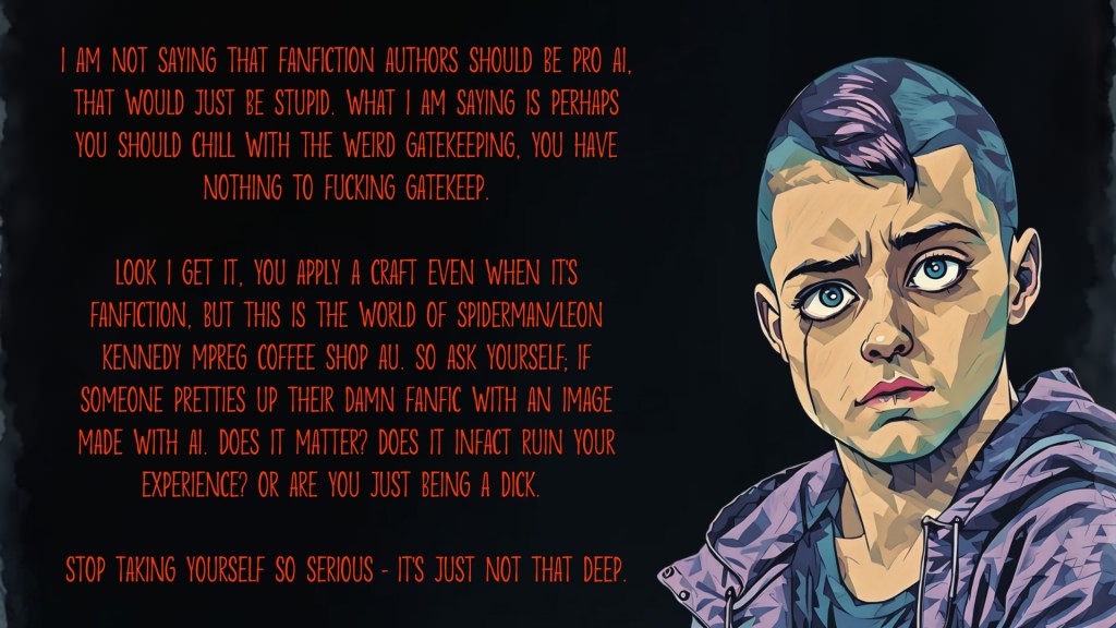 I rest my case… so you can basically rip off authors ip and stay on the moral high ground, because you wrote it yourself? but people who make an image of Gimli in a tutu using midjourney, should be hung at dawn.