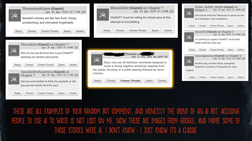 These are classic bot comments from last year’ish. and because of the ai creator witch hunt, everyone was freaking out about being called out for ai, which is why the hate-bot comments looked like this.