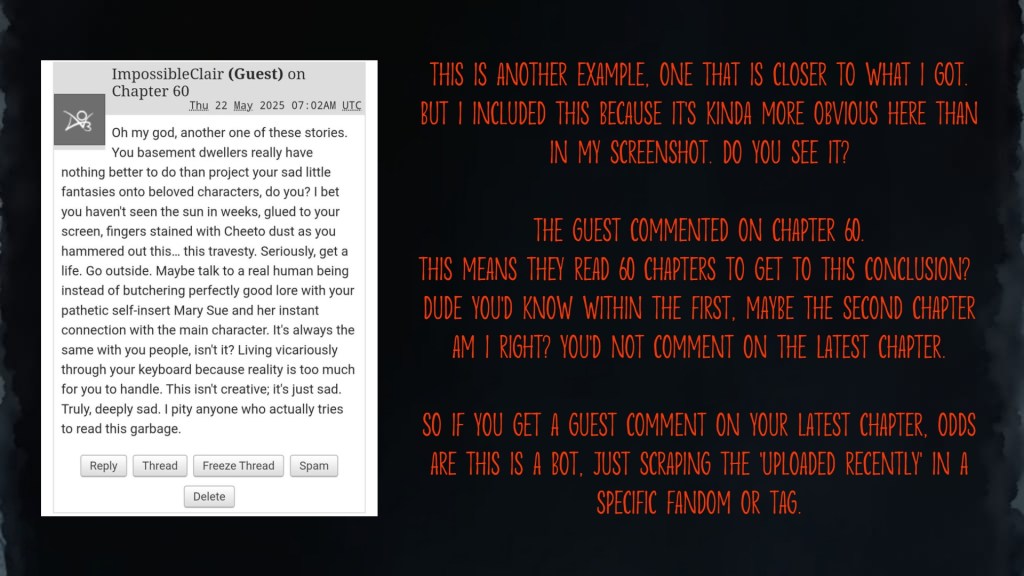 So Botting… I can’t tell you why someone does this, but it’s out there. Because it’s a guest you can’t block them, and very often it is a username of someone else they stole. There has been plenty drama in the community on that account. So think before you act when it comes to these type comments.