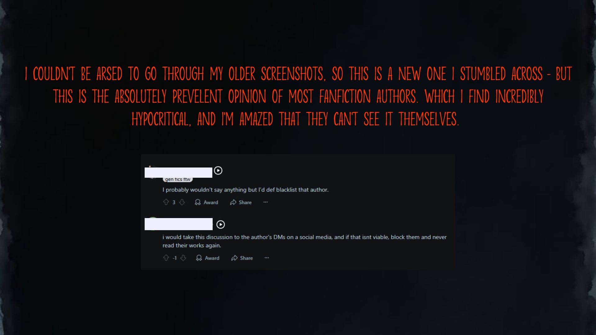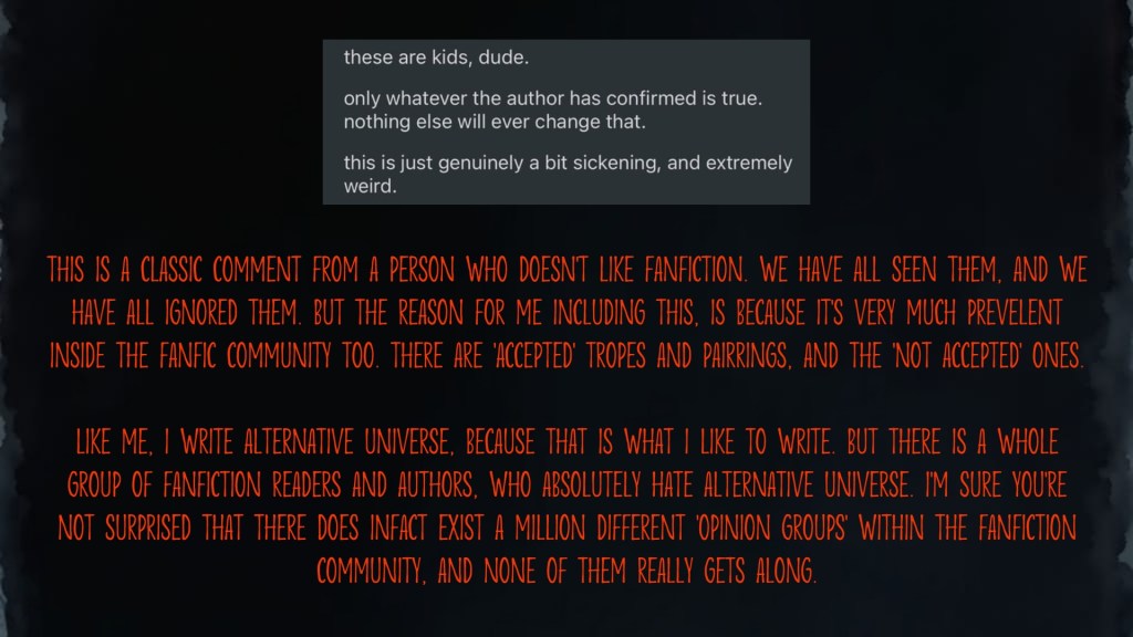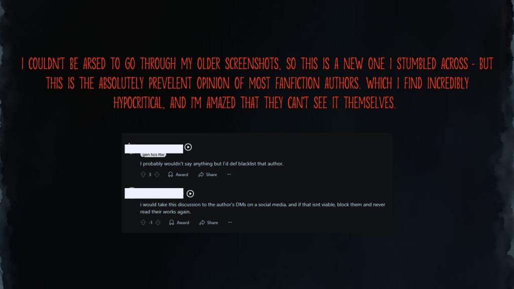 I do have many more examples of this, and you can just go look in fanfiction.net or A03’s reddit – it’s ripe with this kind of bullshit.