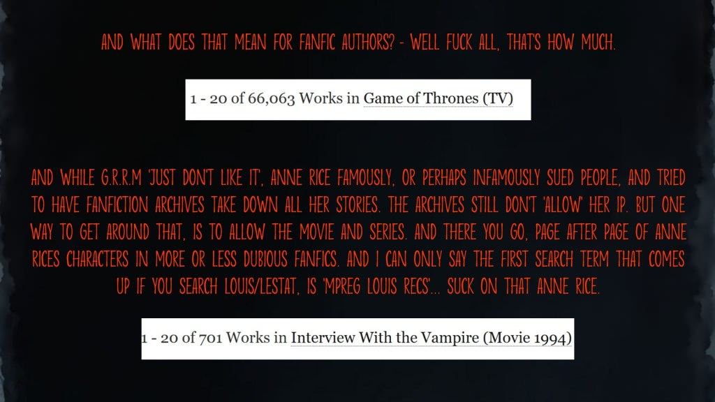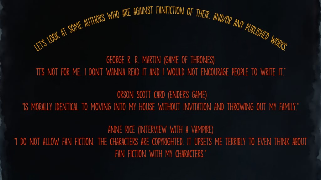 And then there are those like Orson Scott and Anne Rice. And I can tell you as much as I had books of both authors once, but tossed them the moment I learned about their opinion to fanfiction. I don’t want to support them at all.
