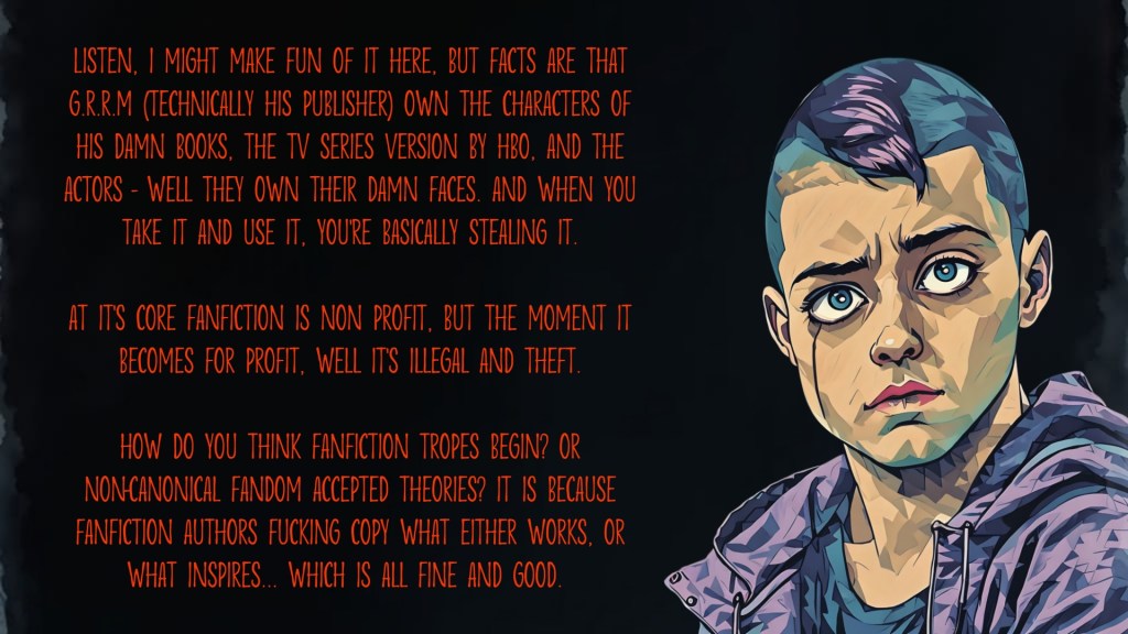 These are just three of many, but I took them because they had some very interesting reasons. While G.R.R.M is by far the least shrill, he does go on to tell people to write their own shit. Said the asshole who didn’t write a book for years *ahem.