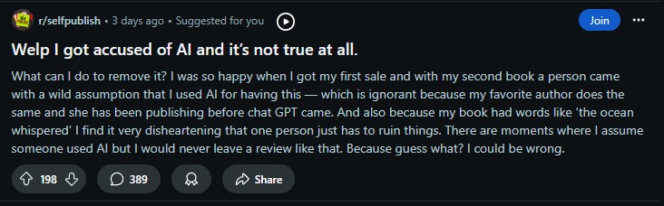 And this, something that is hits close to home for me. The “extremely vigilant anti” who will accuse authors of using AI, will attack authors for using AI covers, or Fanfic authors for using either AI co-writing or AI images in their text as illustrations. You can’t argue with them, because they decided that you used too many dashes, asterisks or like in this case a flowery phrase.