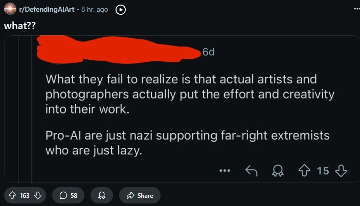 This… this is the “u not woke political anti“. They will write shit like the ‘pro ai are right wing fascists’ – I never quite understood this pretty fucking baseless statement. It is proven time and time again, that political stance, gender and or sexuality has nothing AT ALL to do with your opinion on AI… But a lot of the more shrill anti-crowd people tend to ignore this fact, and just dig deeper into their damn foxhole, facts be damned.