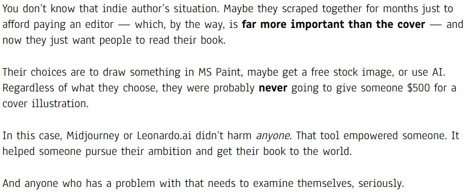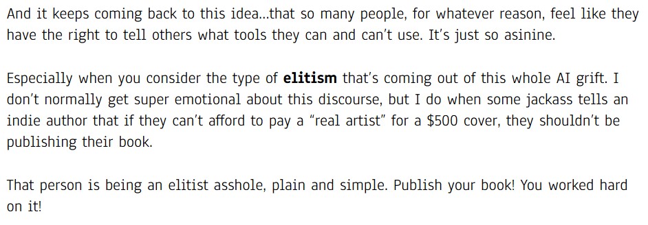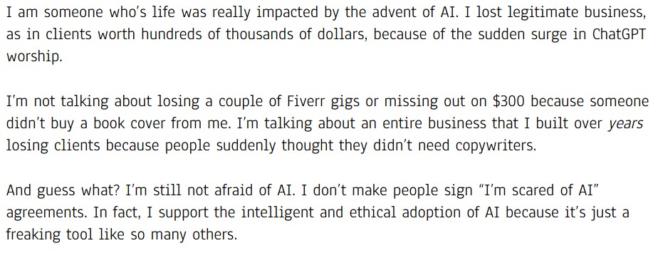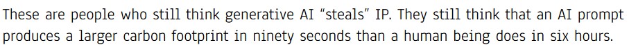 And I did struggle with finding someone who was brave enough to express any sane arguments as to why the anti movement is wacked. And listen, as you might know I am not gung-ho ai bro at all, I do see the pitfalls. But I am also really fucking fed up with the weird black and white logic that the anti movement applies to the debate.