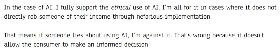 This! This so much! I mean, thank you for saying that. I feel less crazy now. This is what I have been trying to say for fucking ever. There is a difference between using it as a tool, and then using it to scam people. Also I believe we ought to live in a world where people would be unashamed and therefore transparent about use of AI, instead of hiding it with corporate wording, or with very small text in the bottom hoping people won’t see, – or in some cases, just not disclose it at all.