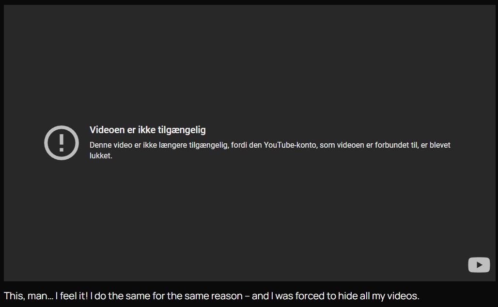 The singular ai-positive video I found, and as the text is in Danish I can tell you it says ‘ this video is no longer available because the youtube account it was associated with is deleted/shut down’ – This is such a shame, she made some wholesome gameplay videos where she talk about a lot of stuff using TTS tools, because she didn’t like her own voice and if I remember correctly she had some speech impediment. This video I linked to back then, was about that. I mean the reason why people use text to speech narration.