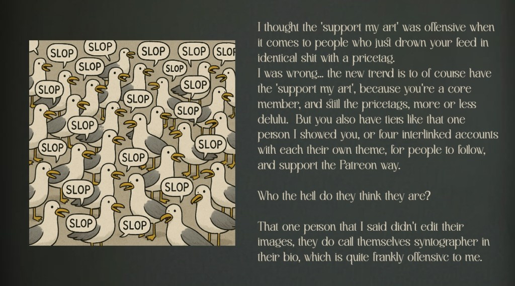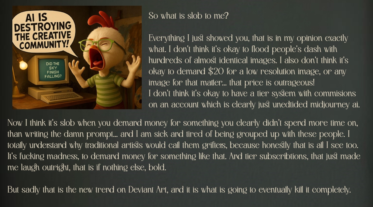 So can a person like me, who make ai based graphics too, really call others out for slob? I think I absolutely can.