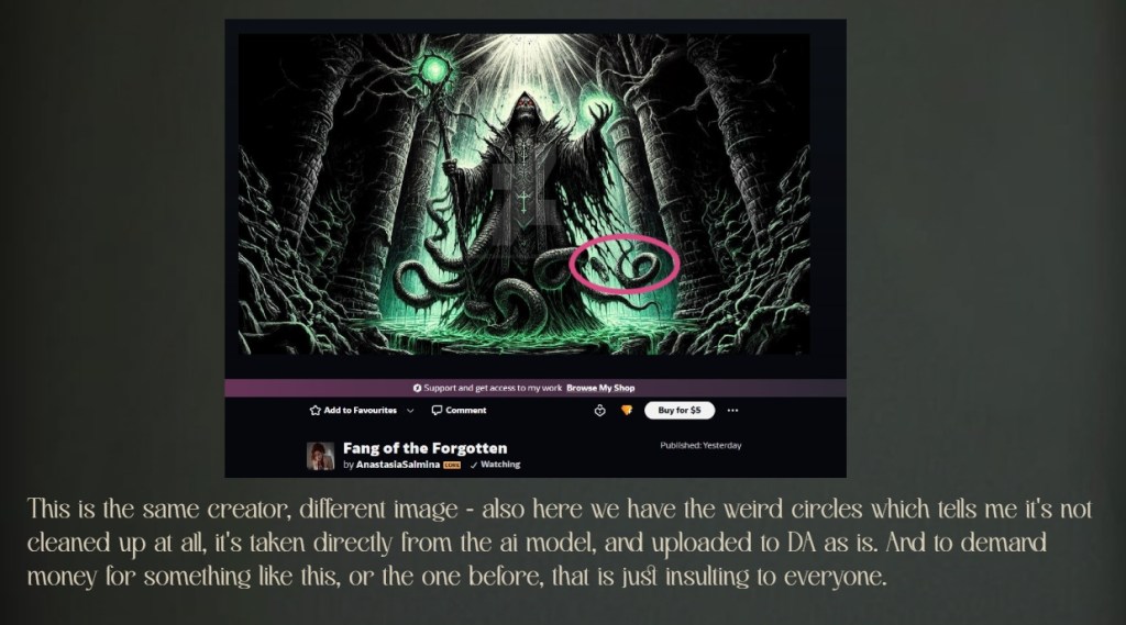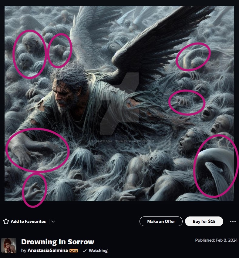 When we click one of these ‘exclusive’ images, we can see that it’s actual terrible, it’s full of ai-noise, and weird arms, something that looks like fish tails, and other craziness. I highlighted the worst offenders.