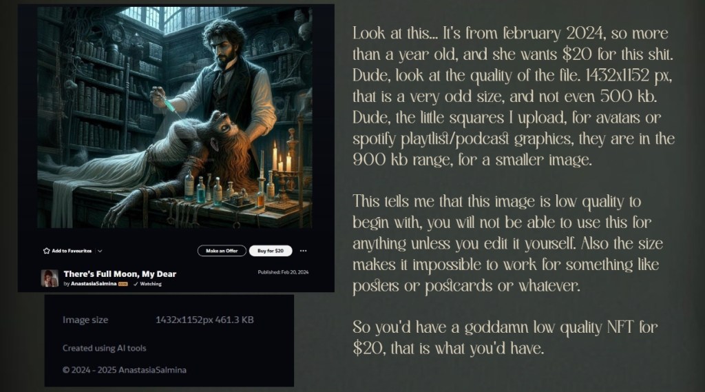 How the fuck can you sell this for $15 and sleep at night? Also the sizing is odd, it’s 1397x1189px 412.13 KB – which tells us (I will slam on that later in this entry, so let me just mention it here) it’s a low res image that you can’t upscale without it getting real weird and grainy.