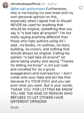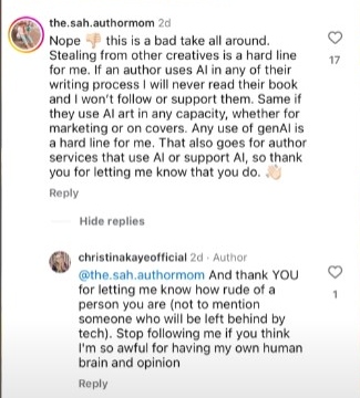At its core it’s about this pretty obnoxious woman (which is C. Kaye), who asked on threads where people felt the line was, when it came to AI writing. I mean what the fuck did she expect?