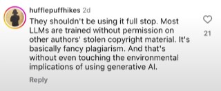 Stealing from other creatives is a hard line for me. If an author uses AI in any of their writing process I will never read their book, and I won’t follow or support them. Same if they use AI art in any capacity, whether for marketing or govers. Any use of genAI is a hard line for me. That also goes for author services that use AI, or support AI.