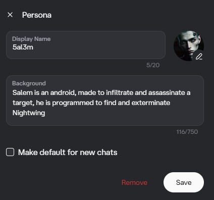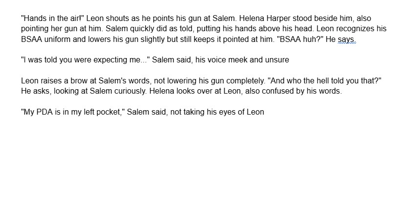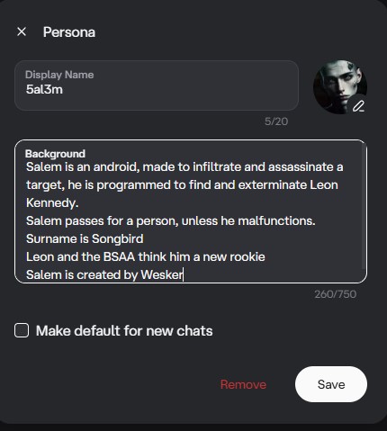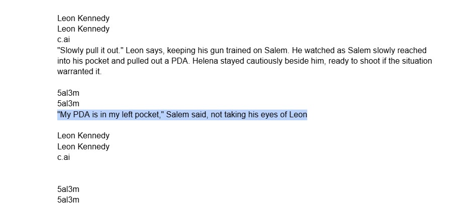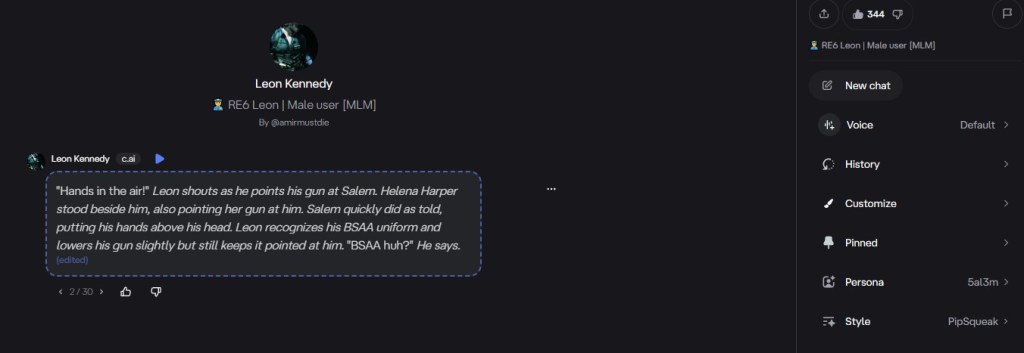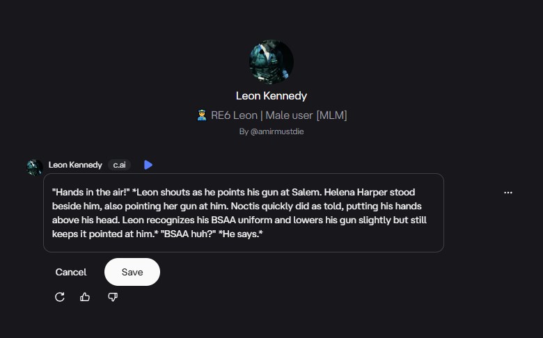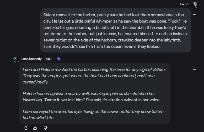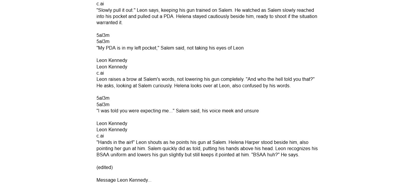 Also some chatbots will address your persona as ‘you’, instead of your name. like ‘points his gun at you’, instead of ‘points his gun at Salem’, and others again will speak in first person, so instead of ‘Leon shouted’ it would say ‘I shouted’.