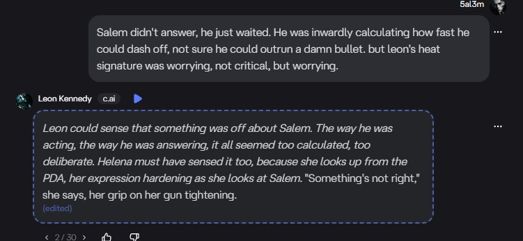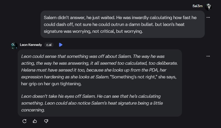 This is a thing that often happens in the not so well made bots, and yeah I was not impressed by this at all. But anyways, note that Leon repeats my text, it makes no sense that he’d notice a heat signature, or see that Salem is ‘calculating something’. Again, you edit the message and delete the part you hate, and continue from there. The moment you delete it, the bot forgot it.