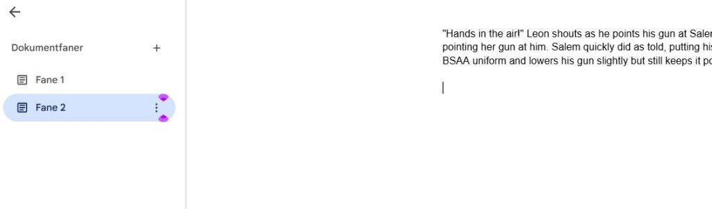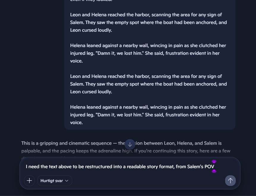Right as you see, I asked it to arrange it for me. I could have selected to do anything here, like make Leon into Elsa, but I decided to keep it simple, to have it restructured to a text that was in a ‘readable story format’ from Salems PoV.